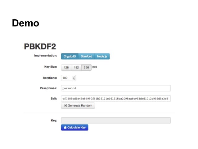 But when i second time generate key for decryption by same password i m getting wrong result decrypted2 is empty so i want to ask what i should store between encryption sessions salt and iv to but as i understood it should be dynamic thanks. Des is now considered to be insecure due to the small key size. It will pick the variant by the size of the key you pass in. Initialize rsa class var rsa new rsa. Crypto js already has a pbkdf2 function built in i e.